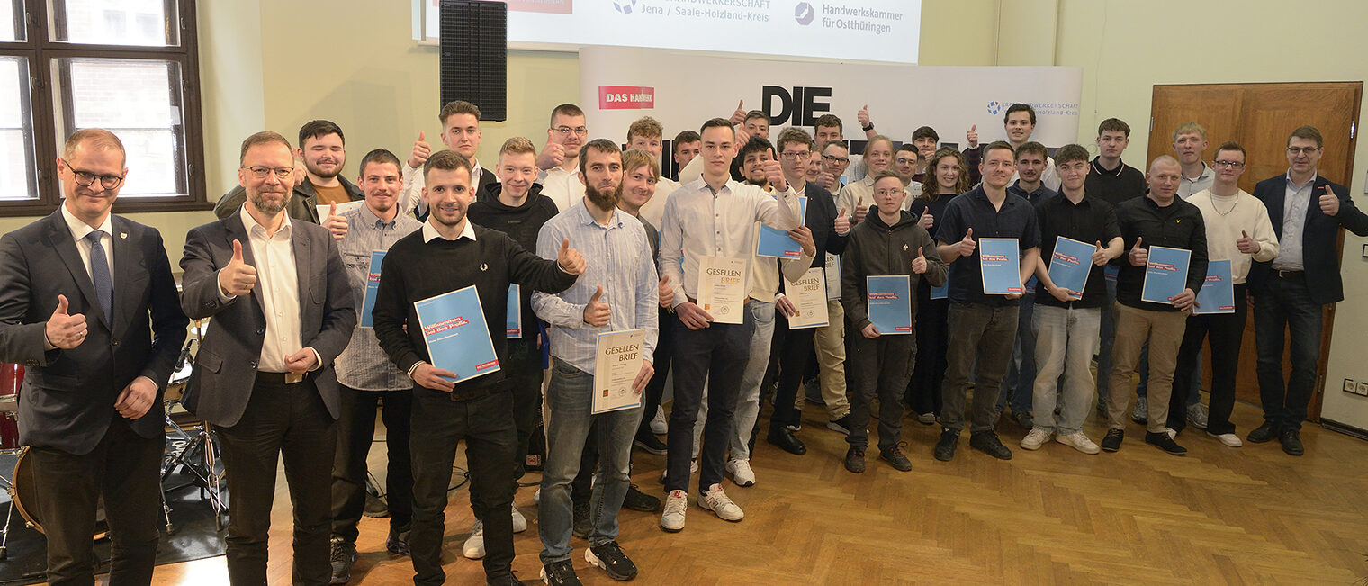Titelbild: Daumen hoch für den erfolgreichen Gesellenabschluss von den 36 Junggesellinnen und -gesellen gemeinsam mit den Ehrengästen zur Gesellenfreisprechung der Kreishandwerkerschaft Jena/Saale-Holzland-Kreis.