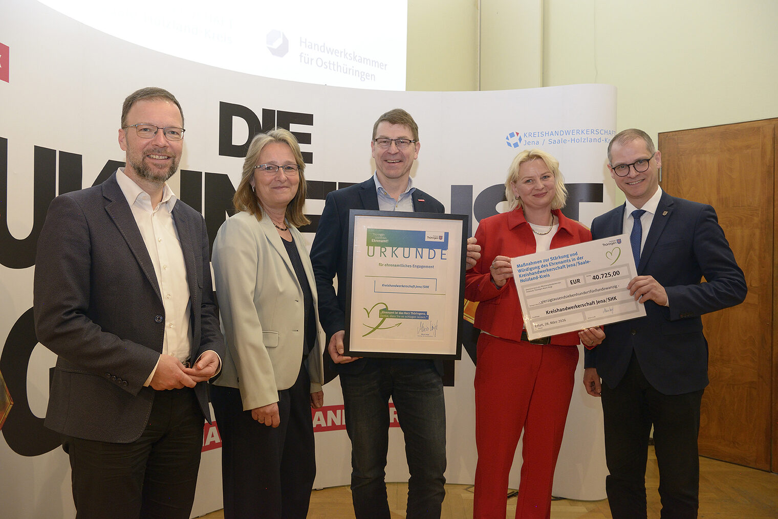 Doch nicht nur die frischgebackenen Absolventinnen und Absolventen standen zur Gesellenfreisprechung im Mittelpunkt. Deutlich wurde zur Festveranstaltung, dass ohne die vielen ehrenamtlichen Handwerkerinnen und Handwerker – wie beispielsweise in den Gesellenprüfungsausschüssen – diese Leistungen auch nicht möglich wären. So gab es an diesem Tag noch eine besondere Überraschung: Guntram Wothly, Ehrenamtsbeauftragter des Freistaates Thüringen, überreichte einen Scheck in Höhe von mehr als 40.000 Euro an Kreishandwerksmeister Matthias Dröschler zur Unterstützung der ehrenamtlichen Arbeit des Handwerks in der Region. Der Scheck war verbunden mit der Urkunde des Ministerpräsidenten Mario Voigt, die das ehrenamtliche Engagement der Kreishandwerkerschaft würdigt.