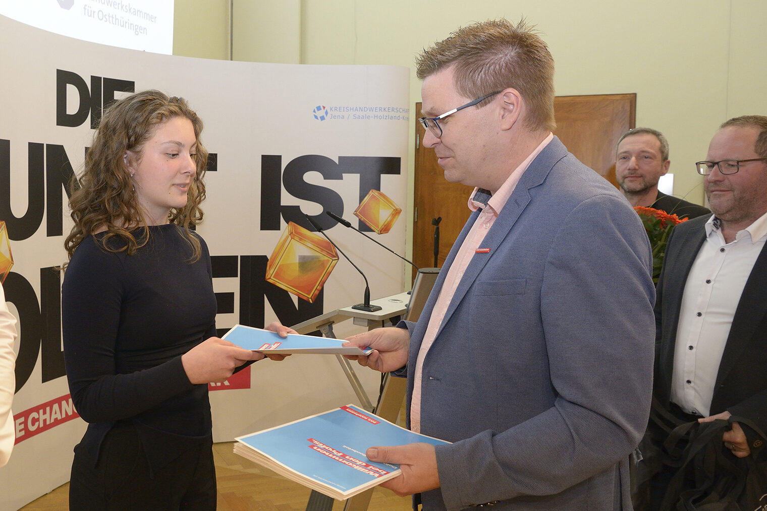 Bevor Kreishandwerksmeister Matthias Dröschler die offizielle Freisprechungszeremonie vornahm, gratulierte auch Jenas Oberbürgermeister Thomas Nitzsche den Absolventinnen und Absolventen. Auch für ihn seien die jungen Frauen und Männer wichtiger denn je für eine gute wirtschaftliche Entwicklung in der Region. „Sie werden alle dringend gebraucht. Man wird bei Ihnen Schlange stehen“, versicherte er. Zwar gelte Jena oft als Hightech- und Wissenschaftsstandort, doch wer baue denn die neuen Universitätsgebäude, wer mache die Digitalisierung überhaupt erst möglich, fragte er. Forschung, Industrie und Handwerk könnten nur gemeinsam wirtschaftliche Stärke schaffen. Dafür seien die jetzigen jungen Fachkräfte aus dem Handwerk unabdingbar.