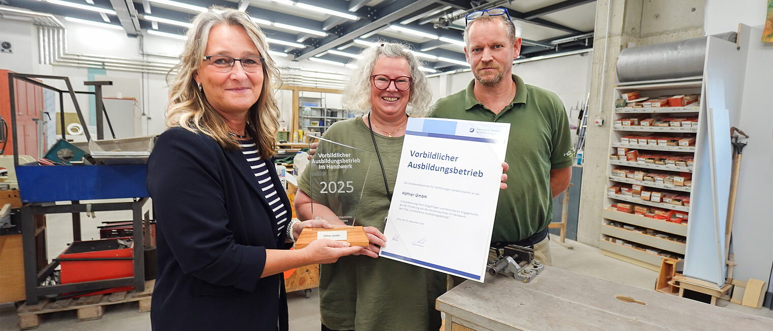Neben Maria Durcak haben seit 2003 12 Azubis erfolgreich ihre Ausbildung bei den Höfners absolviert. Für dieses kontinuierliche Engagement wurde die Tischlerei nun von der Handwerkskammer für Ostthüringen als „Vorbildlicher Ausbildungsbetrieb im Handwerk“ ausgezeichnet. Die Ehrung nahm Katja König, stellvertretende Hauptgeschäftsführerin der Handwerkskammer und Referatsleiterin Berufsausbildung, vor: „Die Berufsausbildung ist heutzutage nicht mehr selbstverständlich. Seit über 20 Jahren bilden Sie kontinuierlich junge Menschen aus, investieren Wissen, Zeit und Herzblut. Zudem bringen Sie sich, Herr Höfner, als stellvertretendes Mitglied im Prüfungsausschuss ein. Dafür möchten wir Ihnen ausdrücklich danken und Sie heute auszeichnen.“