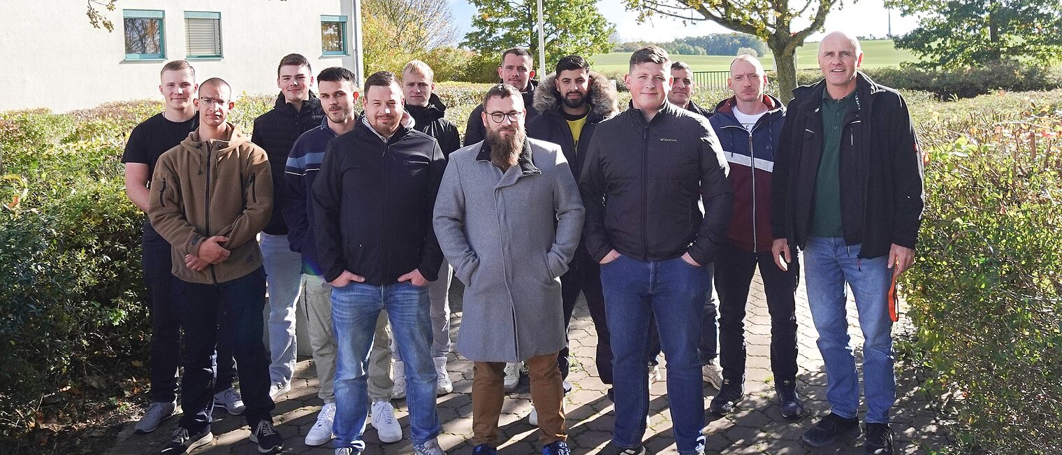 Titelbild: Diese zwölf junge Männer drücken jetzt gemeinsam in einem Vollzeitlehrgang die Meisterschulbank im Fliesen-, Platten- und Mosaiklegerhandwerk in der Bildungsstätte in Gera-Aga. Mit dabei auch Kursleiter und Ausbilder Andreas Röder (re.).