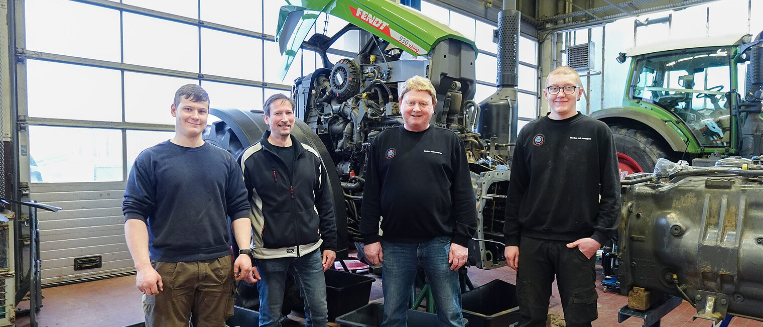 Titelbild: Azubi Elijah Bosold (v.li.) und Werkstattleiter Markus Gentsch von der Raiffeisen Technik Mitte GmbH aus Gera gaben dem schwedischen Berufsschullehrer Berth Hansson vom Ystad Gymnasium einen Einblick in die Werkstatt und waren für zwei Wochen die Praktikumspaten für Auslandspraktikant Caspian Henriksson.