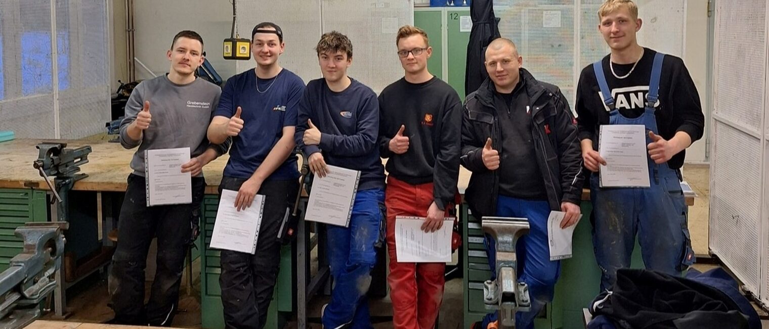 Titelbild: Freude bei den sechs jungen Männern aus Jena und dem Saale-Holzland-Kreis nach ihren bestandenen Gesellenprüfungen vor der regionalen Innung.