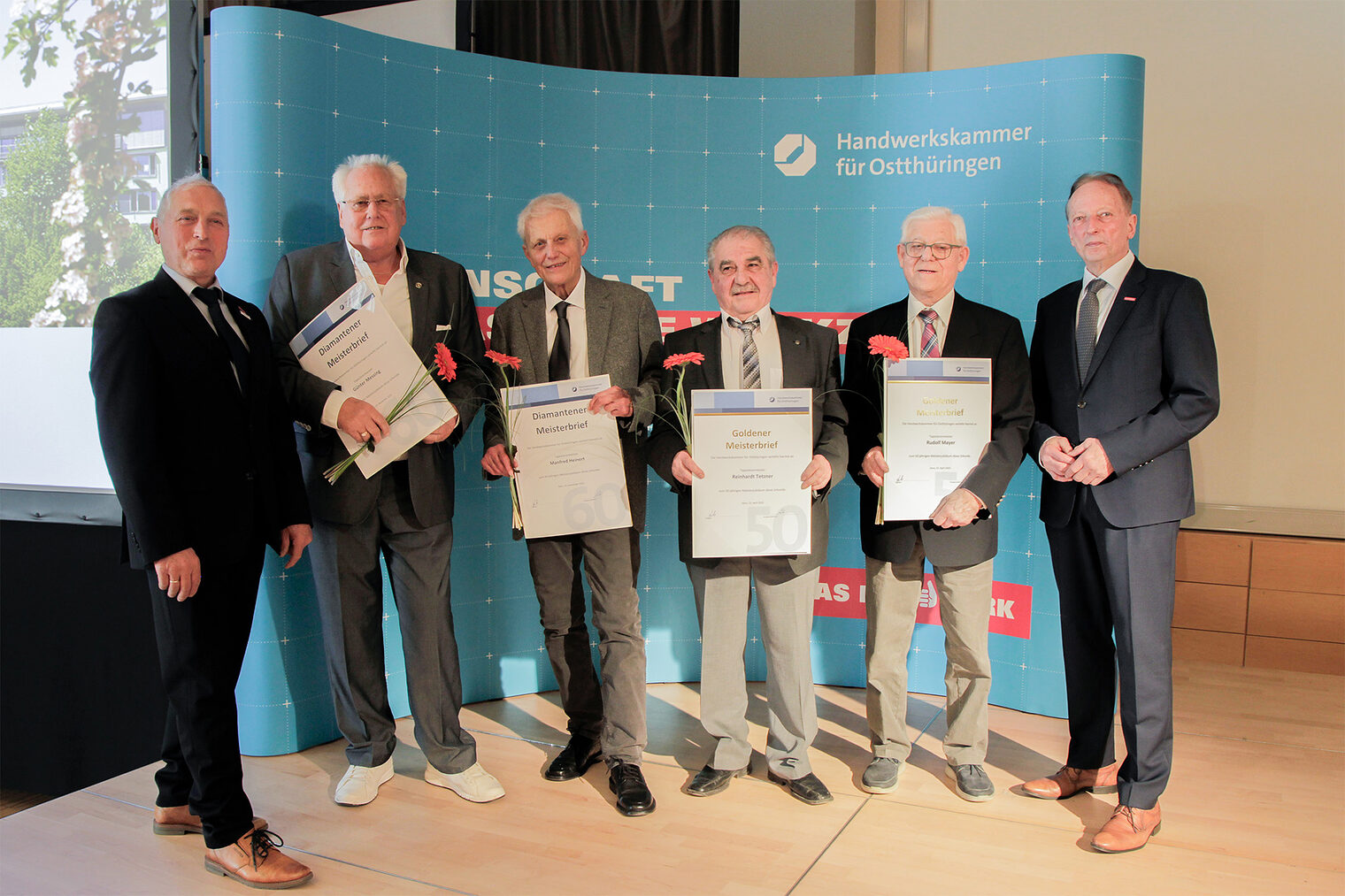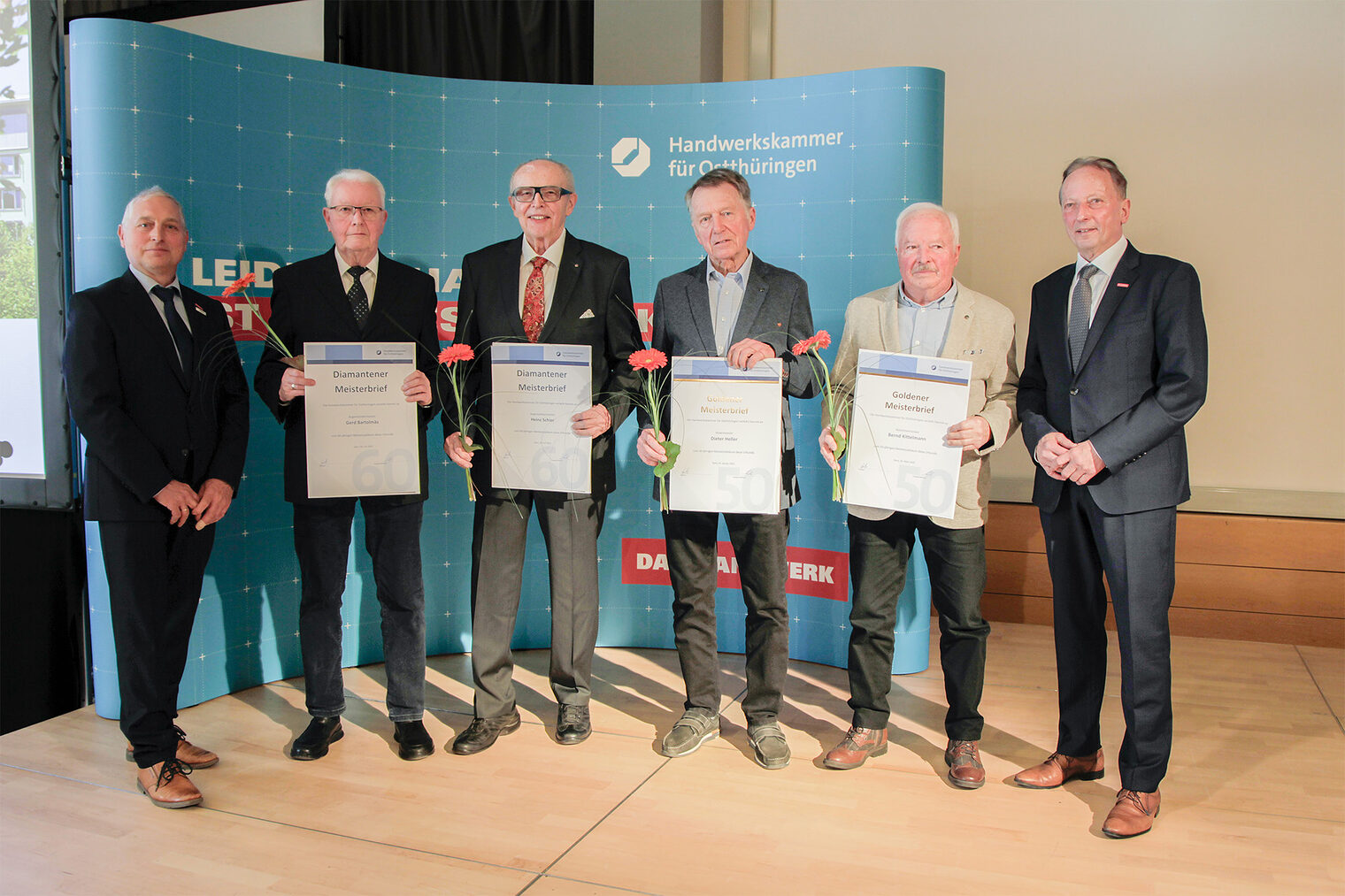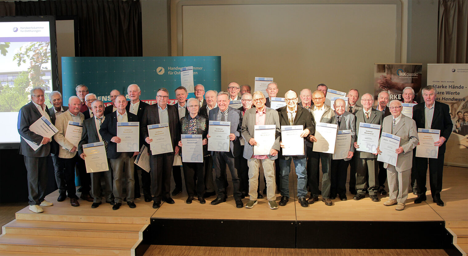 56 Meisterinnen und Meister, die ihr 50-, 60-, oder 70-jähriges Meisterjubiläum im Jahr 2025 feierten, erhielten am 25. Februar 2026 im Rahmen einer Festveranstaltung ihre Goldenen, Diamantenen oder Platin-Meisterbriefe.