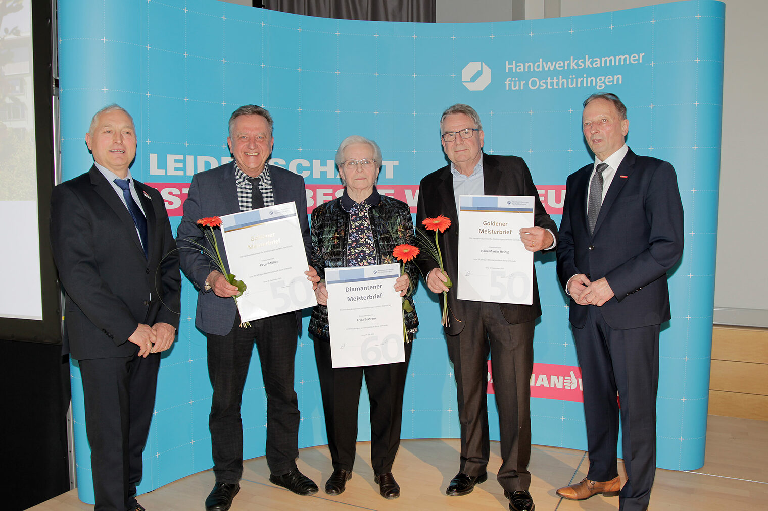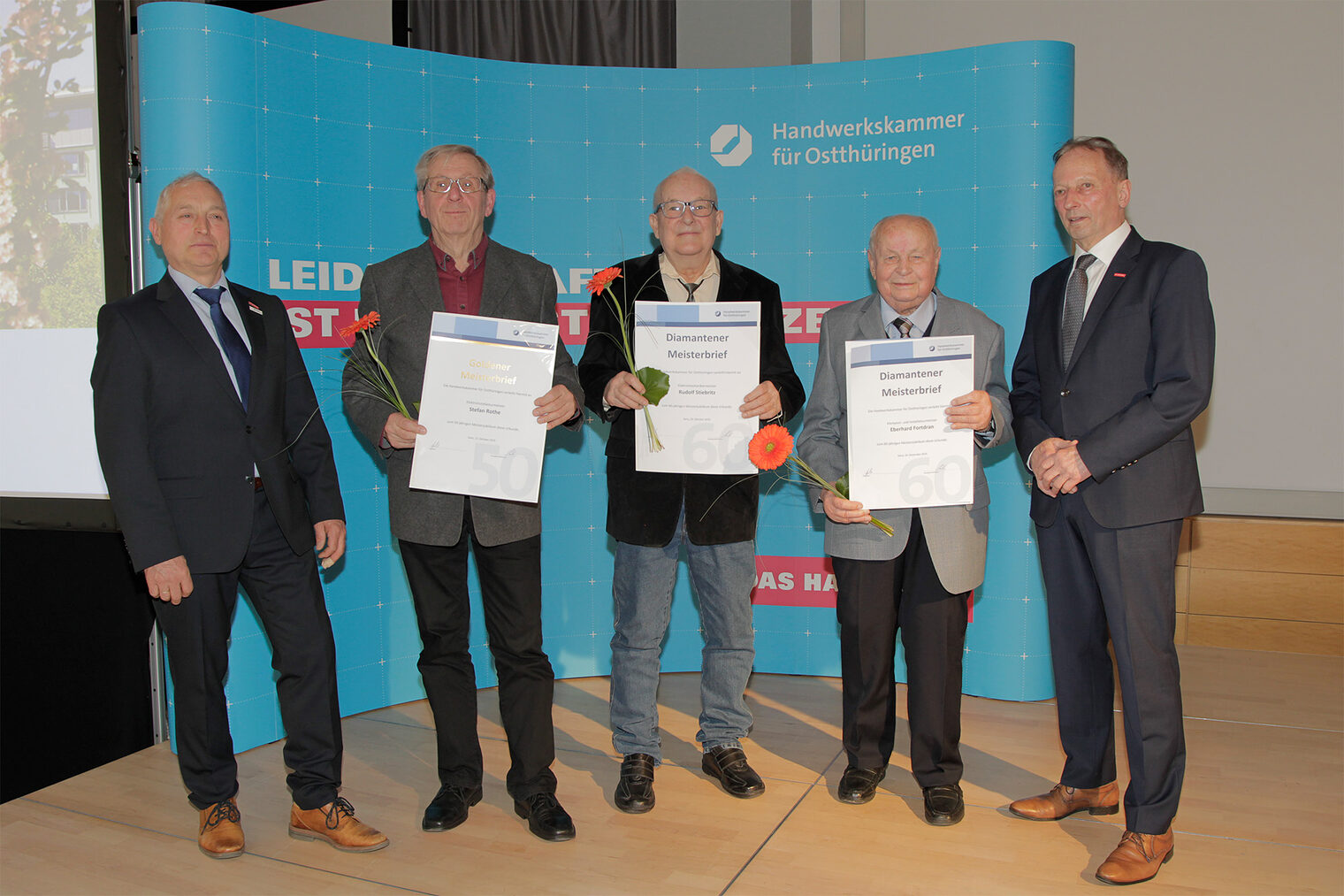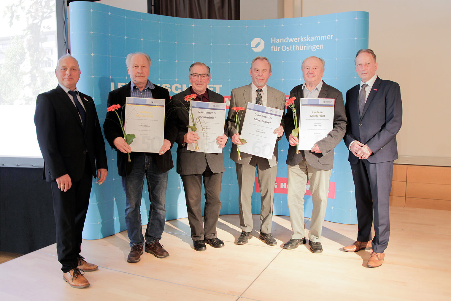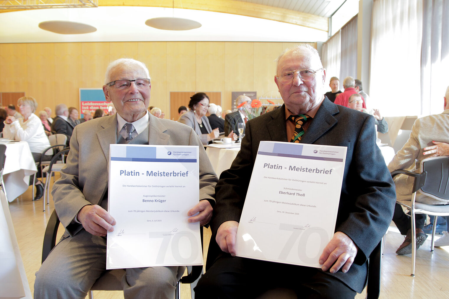 56 Meisterinnen und Meister, die ihr 50-, 60-, oder 70-jähriges Meisterjubiläum im Jahr 2025 feierten, erhielten am 25. Februar 2026 im Rahmen einer Festveranstaltung ihre Goldenen, Diamantenen oder Platin-Meisterbriefe.